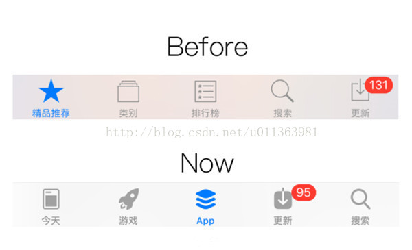 底部导航栏图标,过去的做法是当前激活模块的图标为剪影风格,其他图标为线性风格。设计师需要做两套图标。分别是一套剪影,一套线性。而现在统一为剪影,而当前激活模块的图标使用平铺色代表激活。