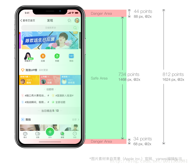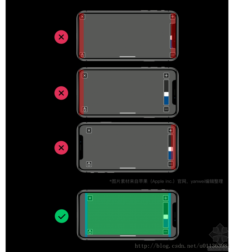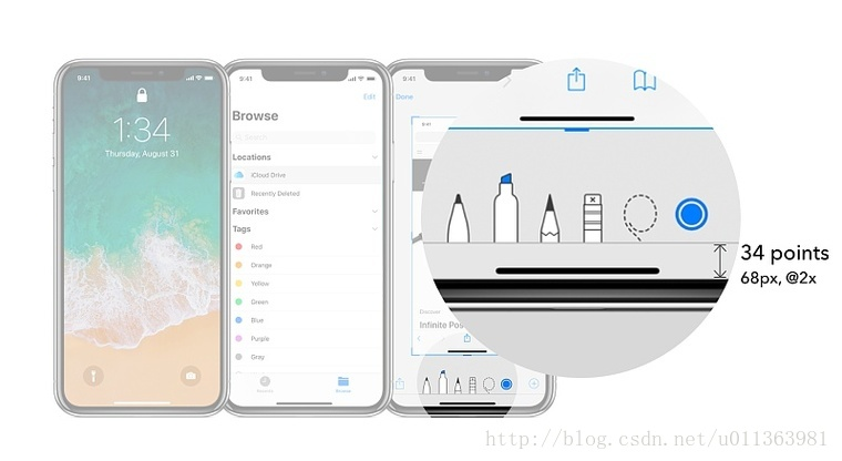 最后说下最核心的问题,Safe Area 范围有多大?比对了官网上所有与iPhone X相关的界面,可以确定,Safe Area区间如下: