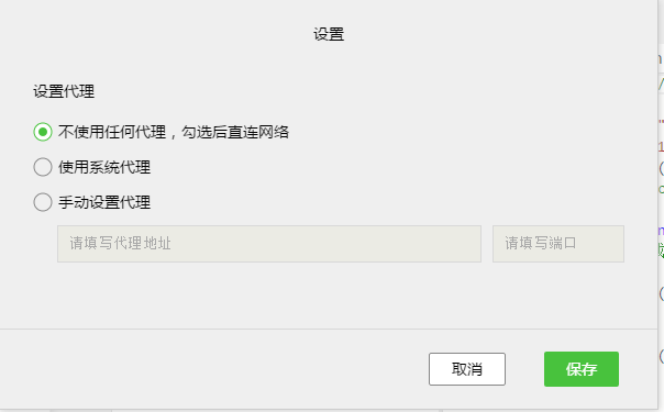 将微信开发工具左上角的设置——》设置代理栏选为不使用任何代理,直接连接服务器