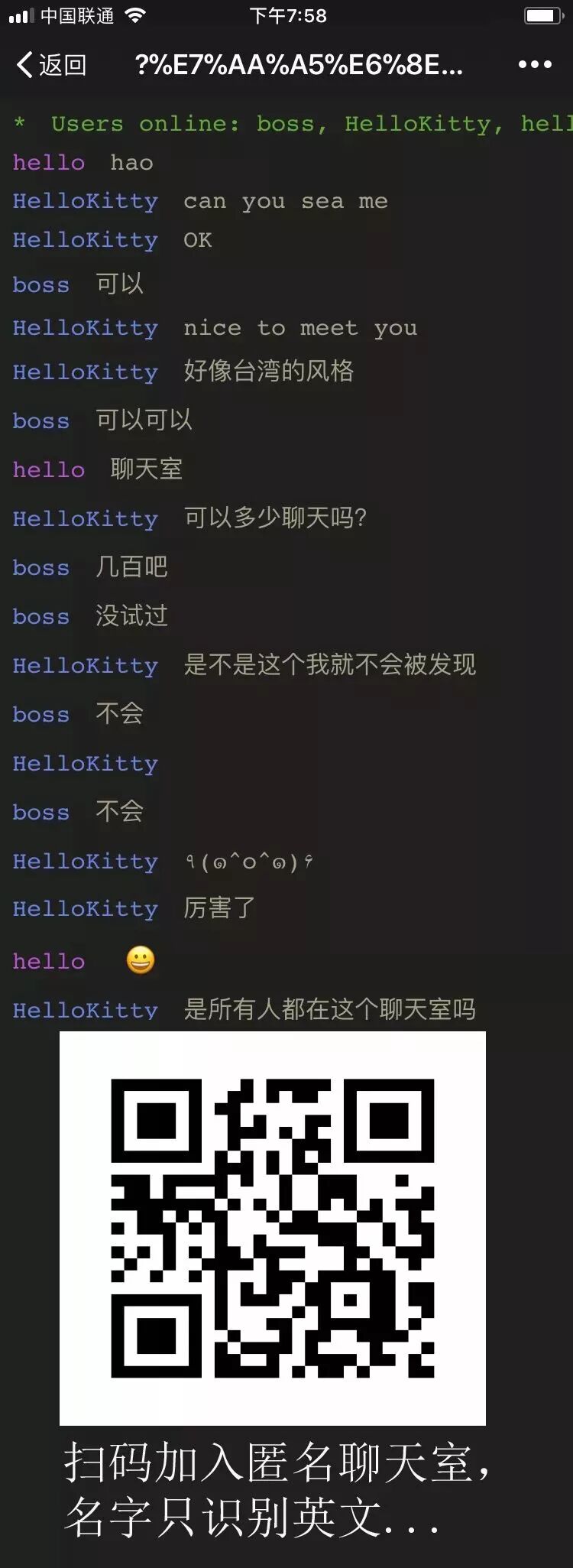 点击创建黑客聊天二维码,上方就会生成一个二维码。只要扫描它(推荐用浏览器扫描),就能进入一个窥探时光公共的匿名群聊了(取名字一定得为英文)。聊天界面如下: