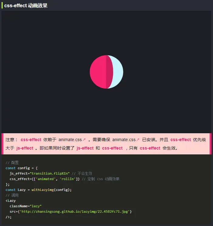 - 指定 css-effect 配置项来配置 animate.css 动画效果