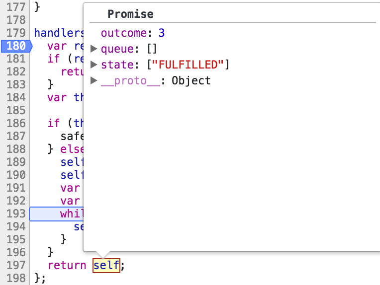 然后去设置当前Promise对象的state,outcome等属性。这里没有进入到193行的while循环里,因为queue是空的。这个地方下文会继续提到。