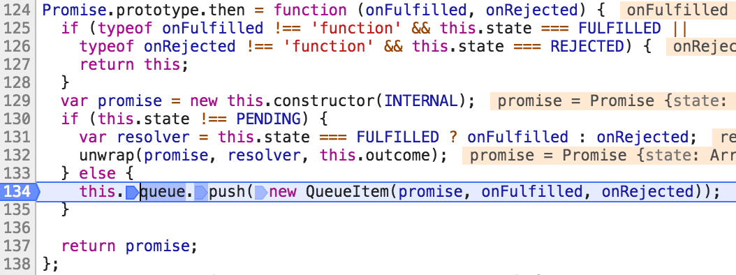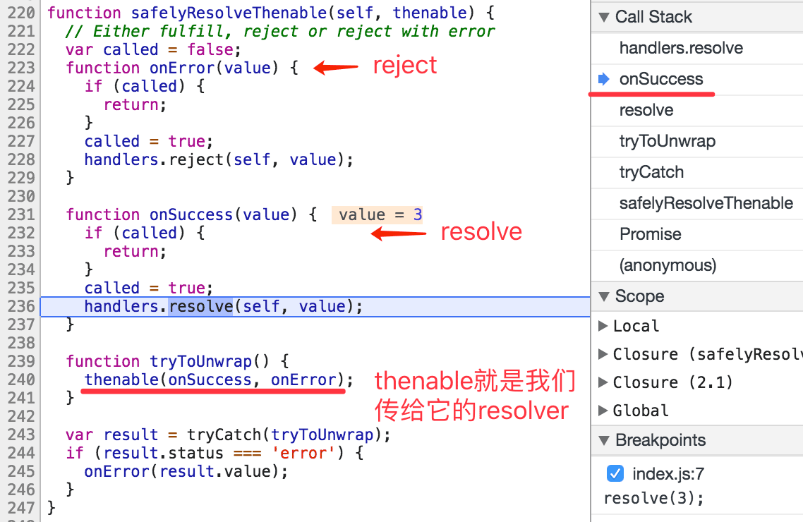 上图执行的thenable函数就是我们传给它的resolver,然后传递onSuccess和onError,分别是我们在resolver里面写的resolve和reject这两个参数。如果我们调了它的resolve即onSuccess函数,它就会调236行的handlers.resolve就到了我们第一次打断点的那张图,这里再放一次: