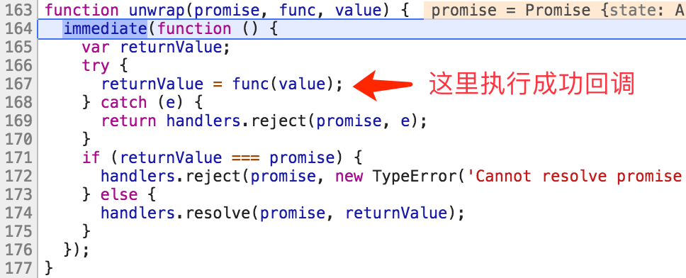 在167行执行then里传给Promise的成功回调,并传递结果outcome。