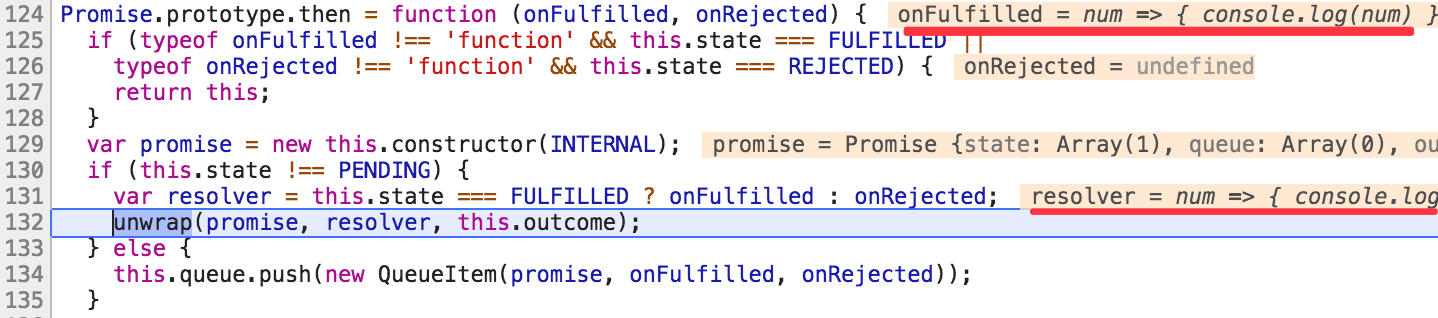 new Promise(resolver).then(num => console.log(num));这个时候,同步执行完resolver,但还没执行resolve,所以在执行then的时候这个Promise的state还是pending的,就会走到134的代码(刚刚执行的是132行的unwrap):