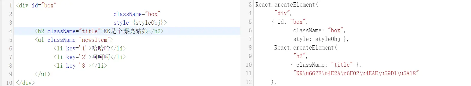 - 首先webpack(webpack底层有babel,babel帮我们在es5/6和react做了一个preset)先把JS中所有的JSX元素变为CREATE-ELEMENT模式,我们可以通过在线的babel转译看一下: