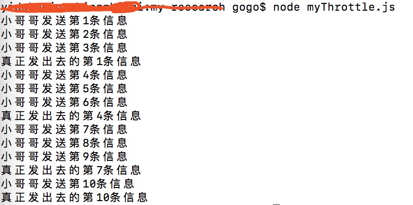 这里,为了演示方便,我们把限流函数的执行间隔设置300ms,使用定时函数设置发送的间隔为100ms,结果如下: