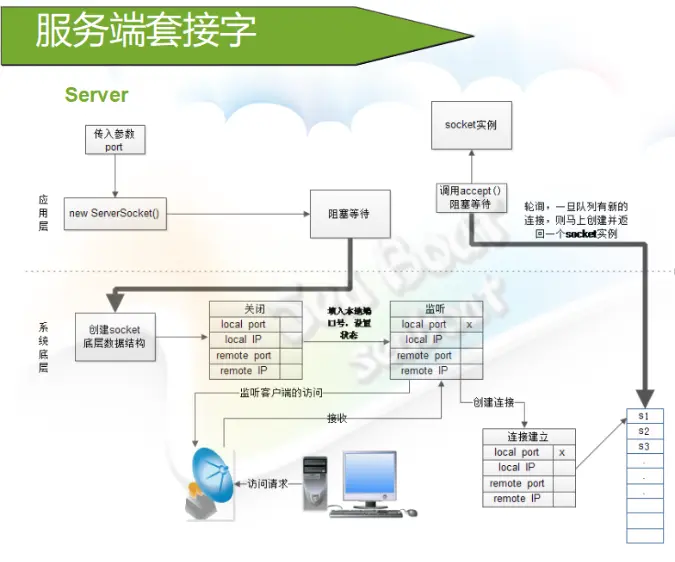 - Serversocket实例调用accept()方法后,即开始轮询队列缓冲区,一旦队列中有新的连接,则创建并返回一个应用层的socket实例。
