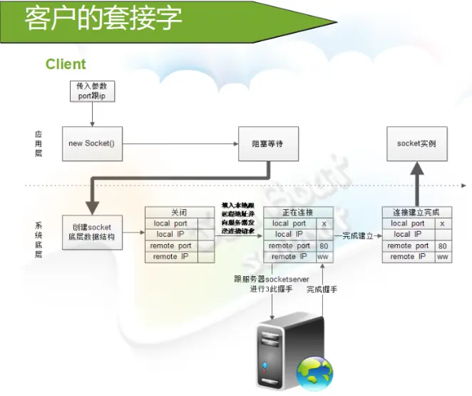 - 向这个socket填入本地、远程的地址跟端口,并向远程服务器发送请求,此时socket的状态为正在连接。