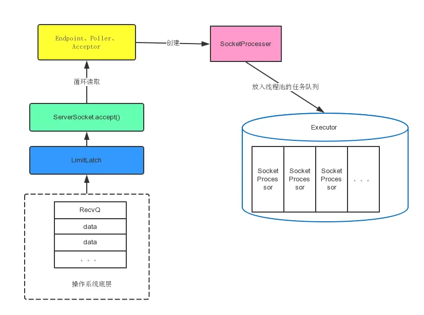 Acceptor是Endpoint的内部类,主要的职责就是监听是否有客户端套接字连接并接收socket,再将socket交由任务执行者(Executor)执行,不断从系统底层读取socket,接着做尽可能少的处理(最好就是接收到后不做任何处理),最后扔进线程池。为什么强调要做尽可能少的处理?这里关系到系统性能问题,过多的处理会严重影响吞吐量。因为tomcat默认只有一个接收器(一条线程负责套接字接收工作),所以它对每次接收处理的时间长短将很可能对整体性能产生影响。于是接收器所干的活都是非常少且简单的,仅仅维护了几个状态变量、流量控制闸门的累加操作、serverSocket的接收操作、设置接收到的socket的一些属性、将接收到的socket放入线程池以及一些异常处理。其他需要较长时间处理的逻辑就交给了线程池,例如对socket底层数据的读取,对http协议报文的解析及响应客户端的一些操作等等,很精妙地将事务剥离,远远提升了系统处理响应性能。Tomcat必然面对用户并发请求,因此这里Socket的处理通过新的线程池来处理。