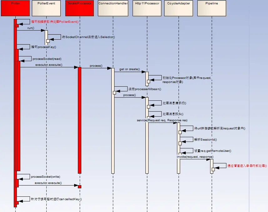 连接建立之后,将一个SocketChannel对象包装成一个NioChannel,并注册到Poller中,由Poller来负责执行数据的读取和业务执行。