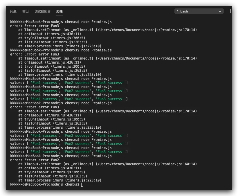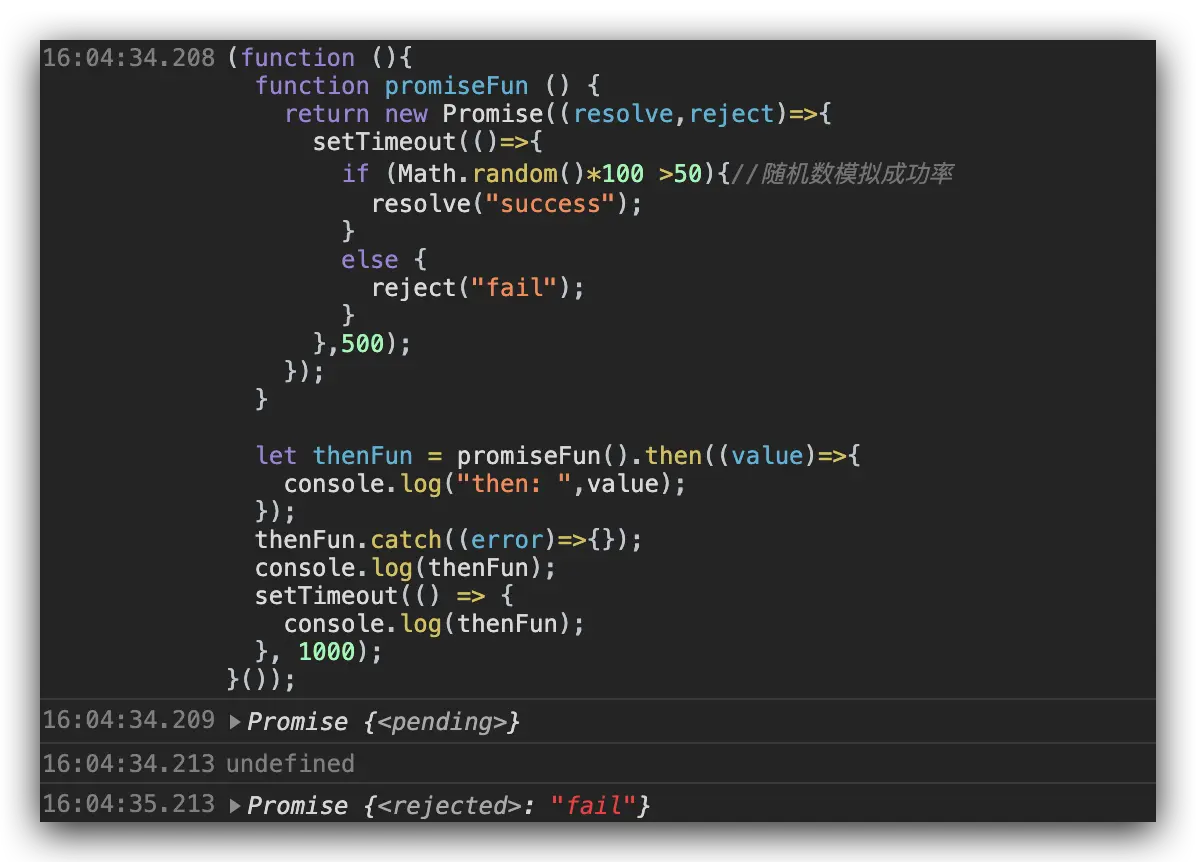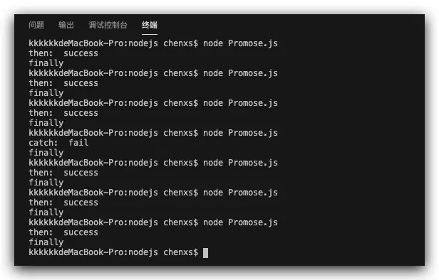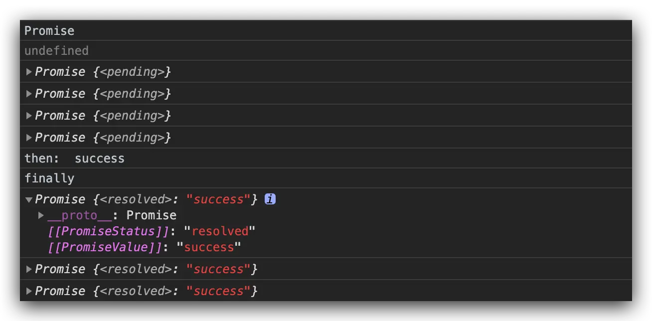 看到这里你可能对类似这样的链式写法promiseFun().then().catch().finally();有点疑惑,其实这是因为then方法,catch方法都返回一个新的 promise 对象,我们来打印看一下: