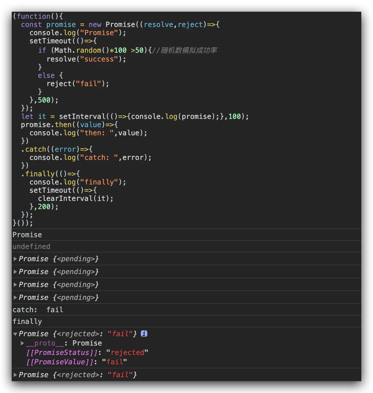 以上代码就是我们常用的比较简单的Promise例子,在这里我们可以看到"finally"每一次都会被打印,而"success"总是在then方法里被打印,"fail"在catch中被打印,我们隐约能看到一点规律,resolve的值的在then方法中回调,reject的值在catch中,最后都走一个finally方法。这就是最简单的用法了。