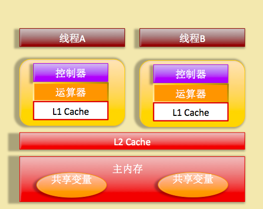 首先他们都会去走上面的三个流程,假如线程A拷贝共享变量到了工作内存,并且已经对数据进行了更新但是还没有更新会主内存(结果可能目前存放在当前cpu的寄存器或者高速缓存),这时候线程B拷贝共享变量到了自己的工作内存进行处理,处理后,线程A才把自己的处理结果更更新到主内存或者缓存,可知 线程B处理的并不是线程A处理后的结果,也就是说线程A处理后的变量值对线程B不可见,这就是共享变量的不可见性问题。