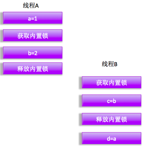 如图当线程A获取内部锁进入同步代码块后,线程B也准备要进入同步块,但是由于A还没释放锁,所以B现在进入等待,使用同步可以保证线程A获取锁到释放锁期间的变量值对B获取锁后都可见。也就是说当B开始执行A执行的代码同步块时候可以看到A操作的所有变量值,这里具体说是当线程B获取b的值时候能够保证获取的值是2。这时因为线程A进入同步块修改变量值后,会在退出同步块前把值刷新到主内存,而线程B在进入同步块前会首先清空本地内存内容,从主内存重新获取变量值,所以实现了可见性。但是要注意一点所有线程使用的是同一个锁。