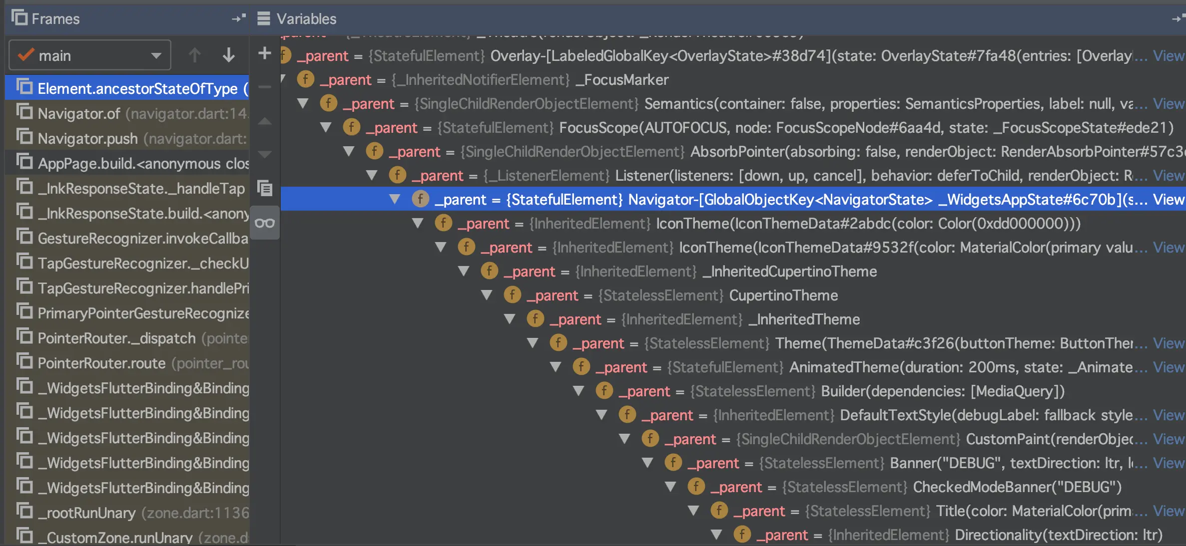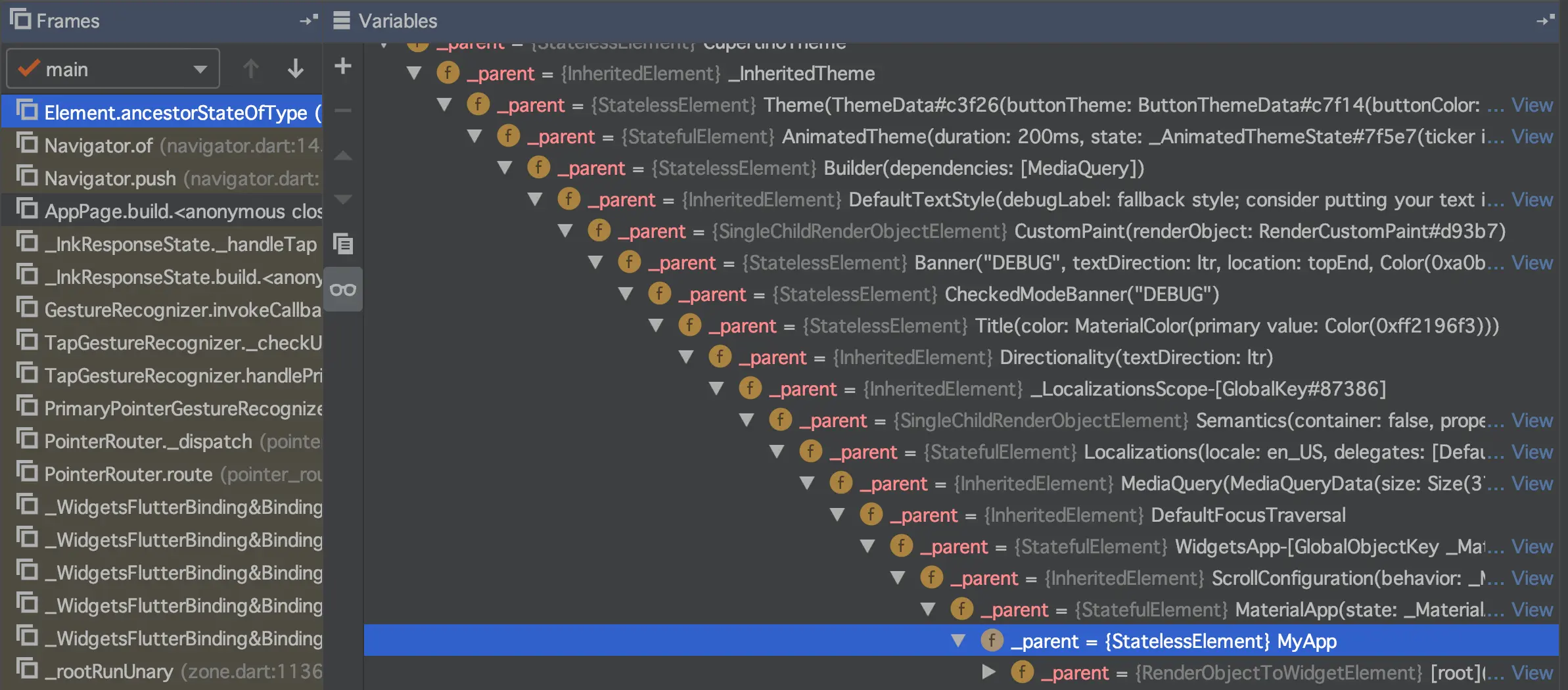 由于这条树干太长,因此只截取了部分。可以看到上部分的顶端是AppPage,下部分的底端是MyApp,而中间是Navigator。