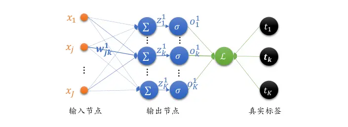 我们把单个神经元模型推广到单层全连接层的网络上,如下图所示。输入层通过一个全连接层得到输出向量 ,与真实标签向量