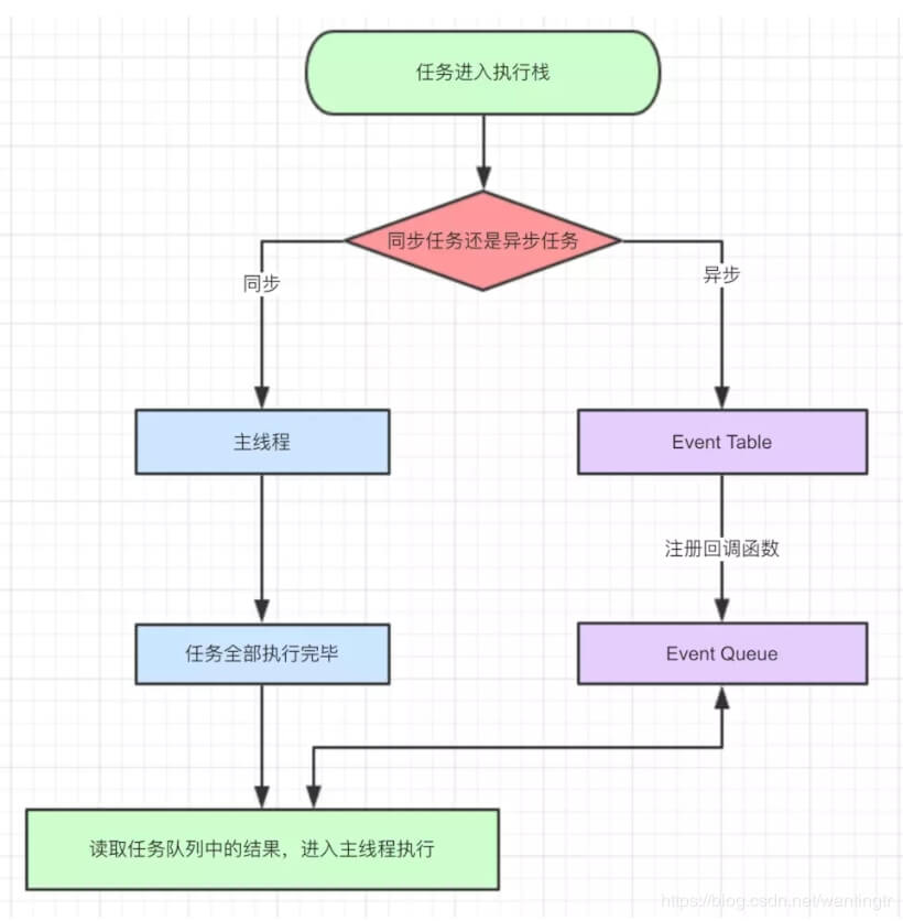 - 同步和异步任务分别进入不同的执行 process,同步的进入主线程,异步的进入Event Table并注册函数。