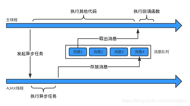 主线程在发起 AJAX 请求后,会继续执行其他代码,AJAX 线程负责请求 XXX,拿到请求后,会封装成 JavaScript 对象,然后构造一条消息: