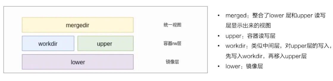 OverlayFS底层目录称为lowerdir, 高层目录称为upperdir,合并统一视图称为merged
