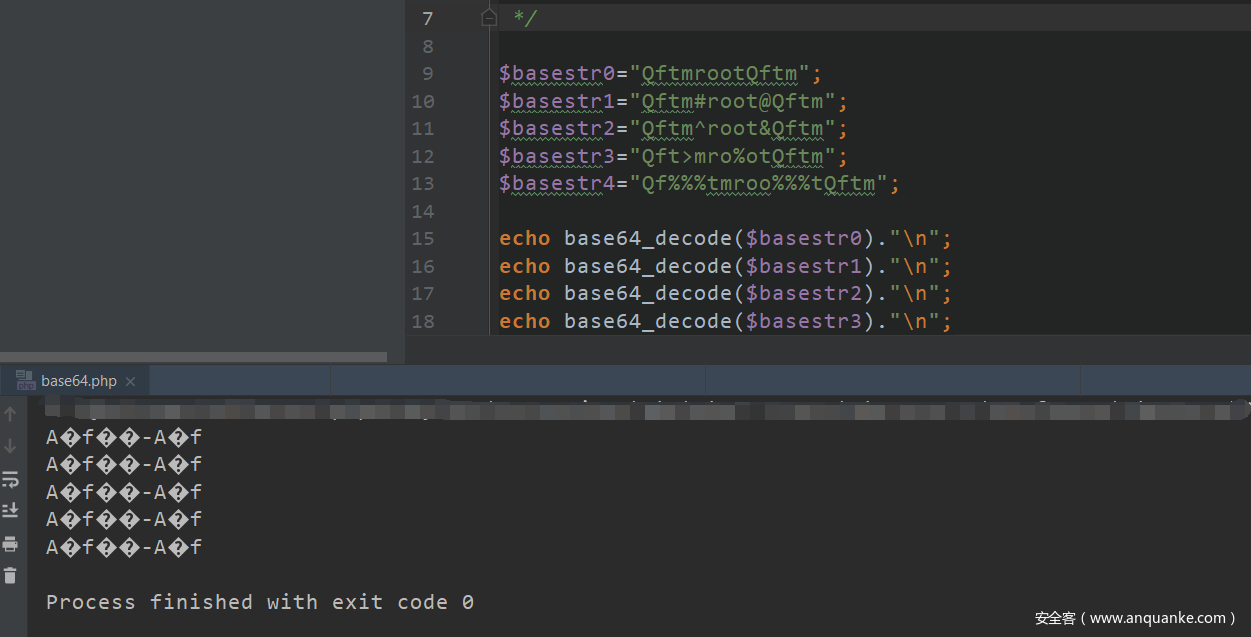 base64编码中只包含64个可打印字符,而PHP在解码base64时,遇到不在其中的字符时,将会跳过这些字符,仅将合法字符组成一个新的字符串进行解码。下面编写一个简单的代码,测试一组数据看是否满足我们所说的情况。