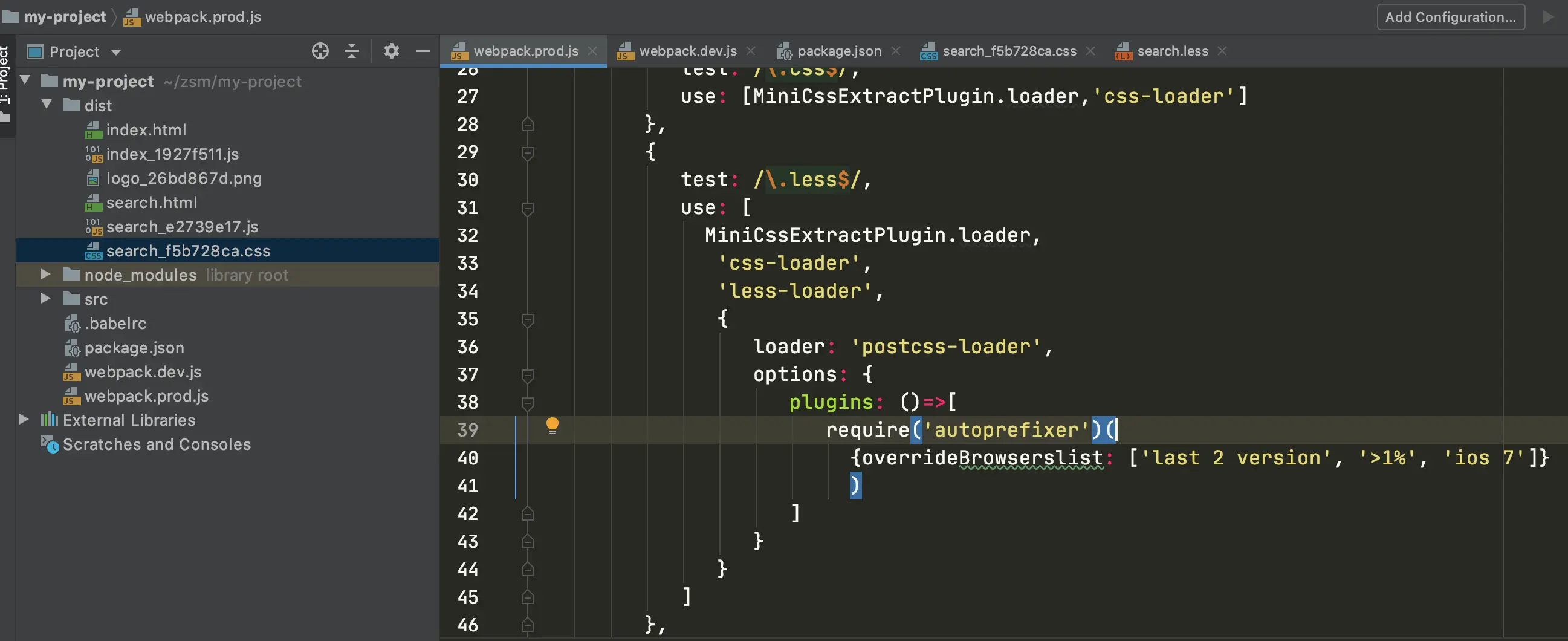 autoprefixer这个其实是css的后置处理器,与less,sass不同,less,sass通常是css的预处理,预处理器就是在是在打包前置去处理,autoprefixer是样式处理好之后,代码最终生成之后,在对它进行后置处理。我们来看一下autoprefixer的用法。