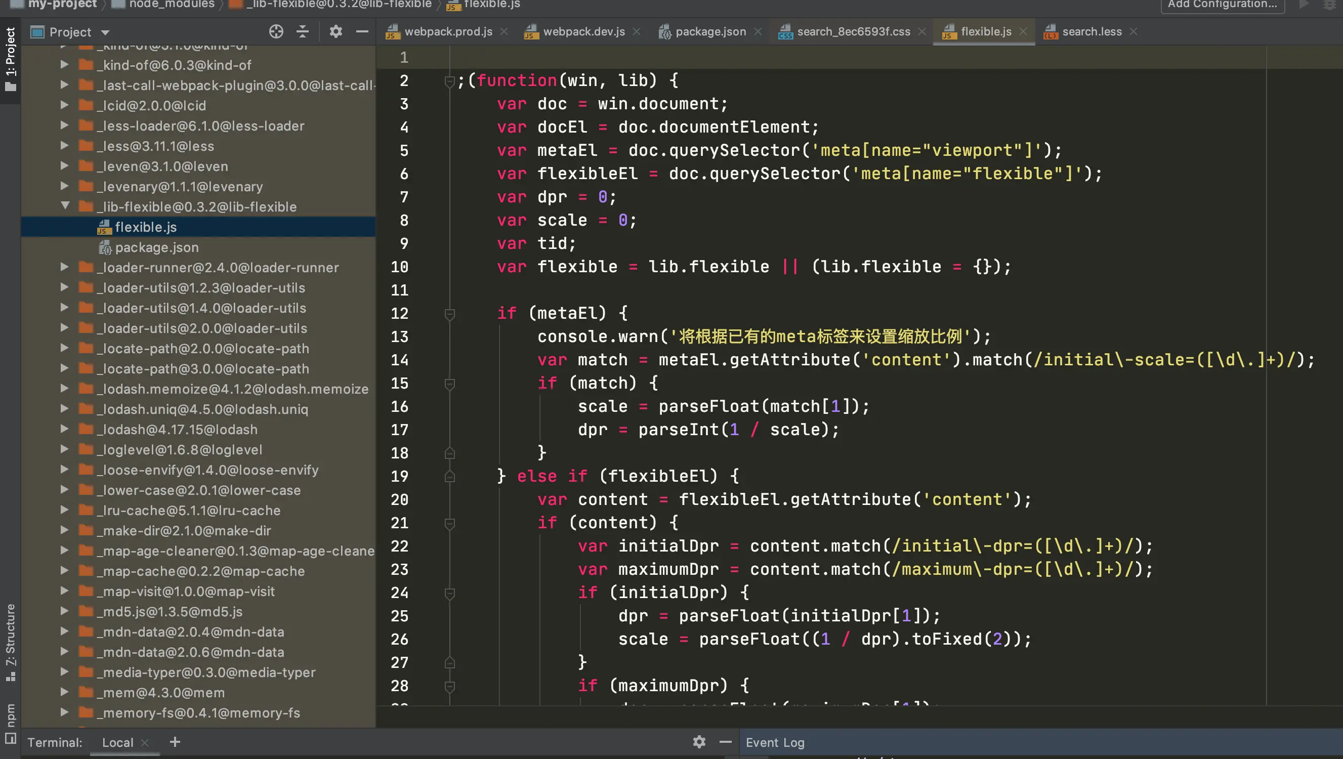 这里面主要是使用px2rem-loader,我们通过px2rem-loader来将px转换成rem。px转换成rem之后,我们需要知道1rem等于多少px。这个时候我们需要在页面打开的时候动态的去计算根元素font-size的值。这个时候我们可以利用手机淘宝的比较成熟的方案,lib-flexible,它会自动的根据当前设备的宽高来计算根元素实际的font-size的值。接下来在代码里面看一下效果。首先安装一下px2rem-loader