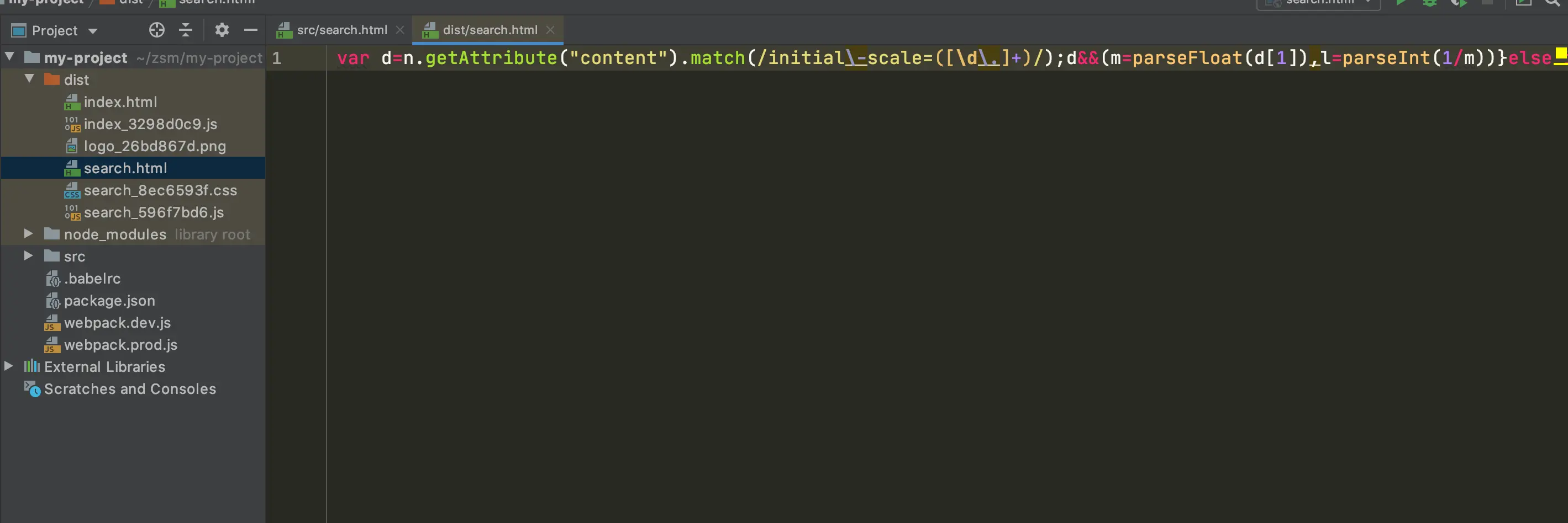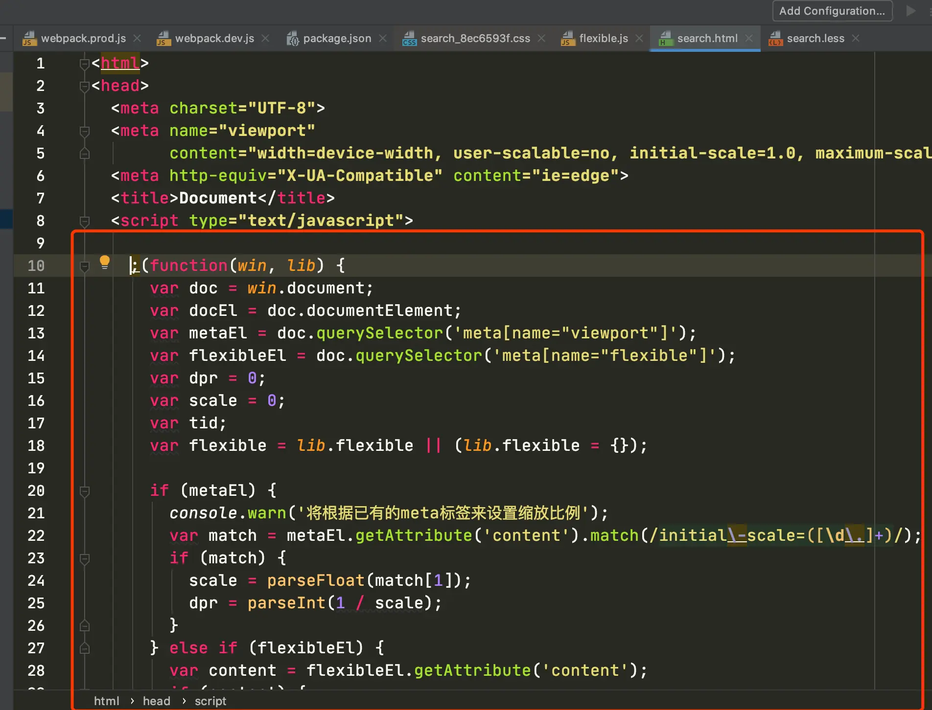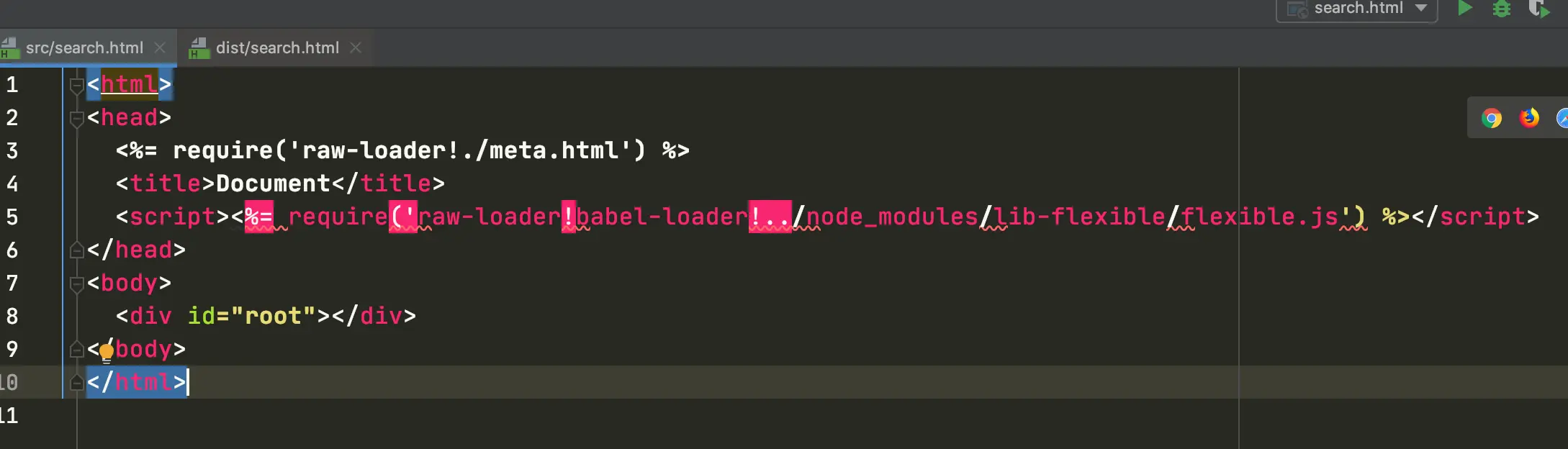 接下来我们在把rem计算的脚本引入进来,删掉上节的直接复制写入script标签里面的。需要把引入的放到script标签里面去。raw-loader加一个babel-loader