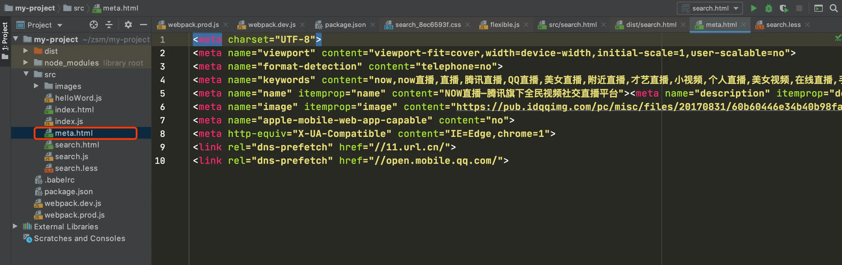在模版index.html里面引入一下这个raw-loader。指定文件路径${ require('raw-loader!./meta.html')}