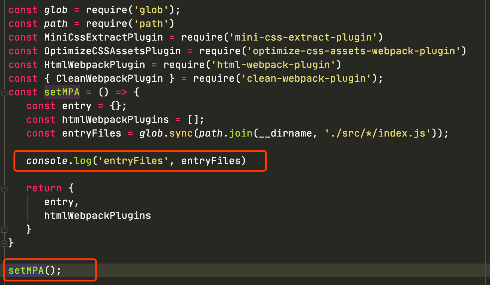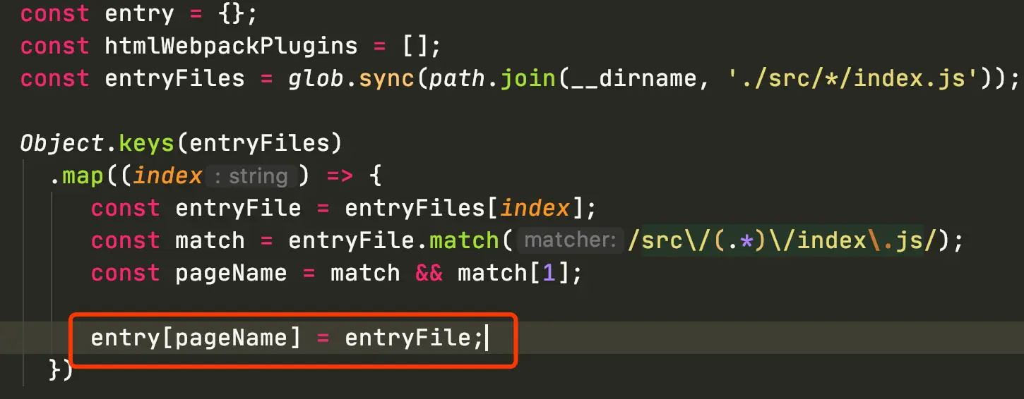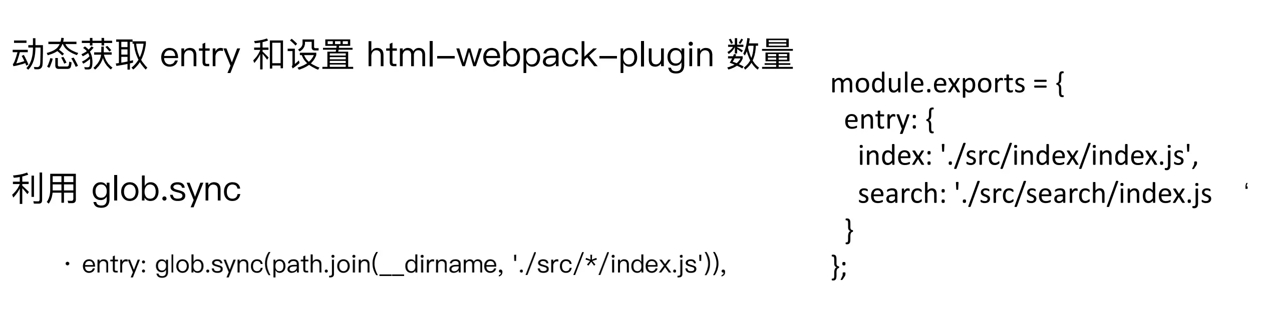 这里面我们可以利用glob.sync,glob.sync就是说以同步的方式把这些文件都查询出来,glob.sync我们获取当前的构建的目录下面,__dirname就是运行脚本时候所在的目录也就是项目的根目录,根目录下面的./src这个文件夹下面,匹配src下面所有的一级的目录./src/* 匹配完之后在index.js这样的话我们就把所有的entry动态的获取出来了,接下来我们根据获取出来的entry数量动态的去获取html-wbpack-plugin的数量,其实就可以解决问题,接下来我们来看一下具体的实现。