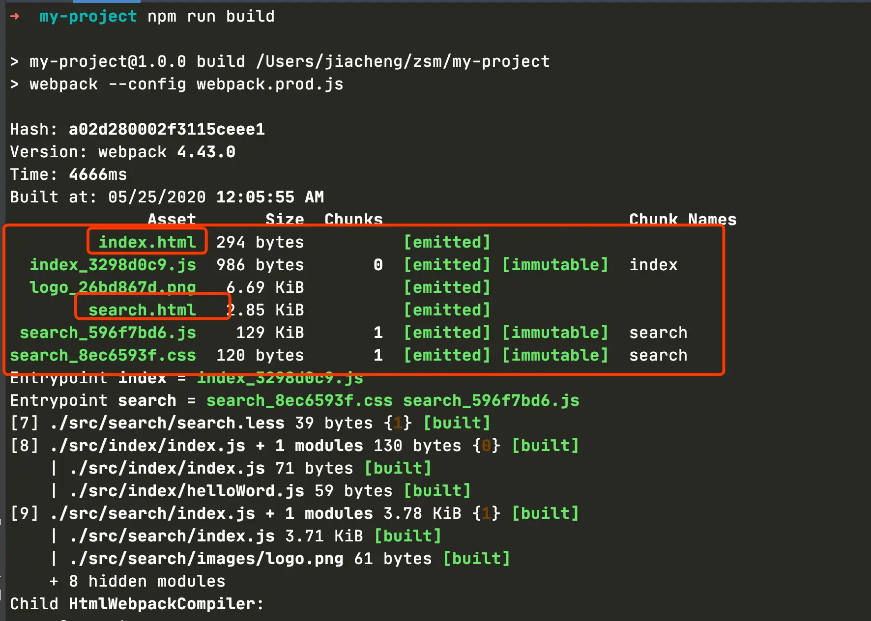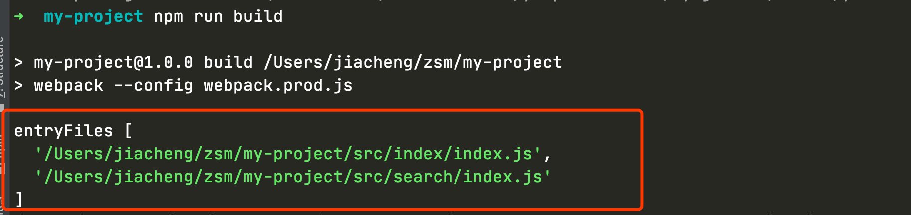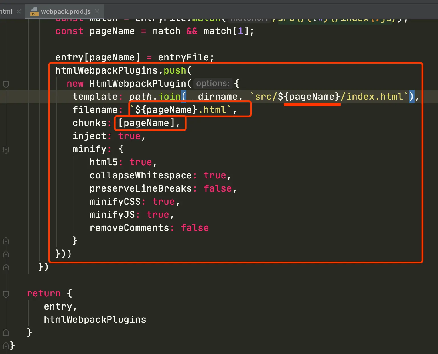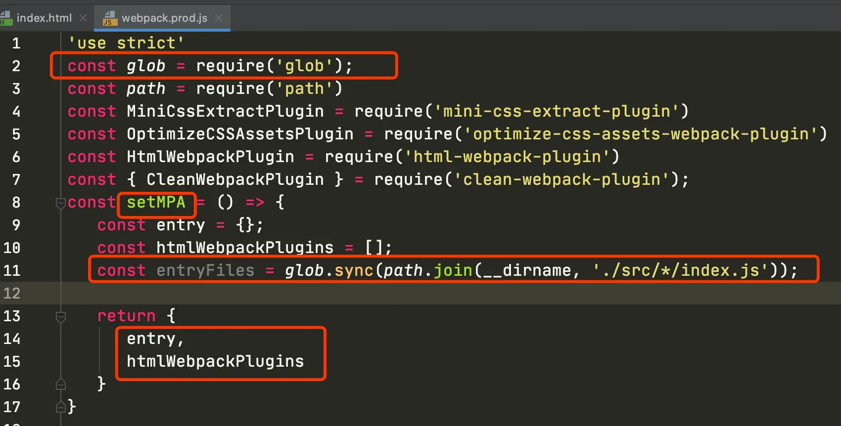 这里面我们可以利用glob.sync,glob.sync就是说以同步的方式把这些文件都查询出来,glob.sync我们获取当前的构建的目录下面,__dirname就是运行脚本时候所在的目录也就是项目的根目录,根目录下面的./src这个文件夹下面,匹配src下面所有的一级的目录./src/* 匹配完之后在index.js这样的话我们就把所有的entry动态的获取出来了,接下来我们根据获取出来的entry数量动态的去获取html-wbpack-plugin的数量,其实就可以解决问题,接下来我们来看一下具体的实现。