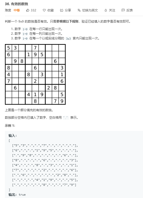 - 对于行、列、块,分别预设九个哈希表,键值对<出现的数字,数字出现的总次数>,遍历所有行列,对每一行(列、块同理),键的个数如果小于值的总和,代表同一个数字出现了不止一次,则判定为false。