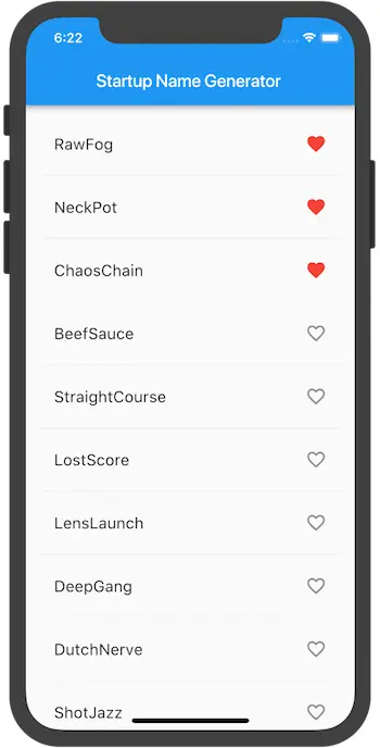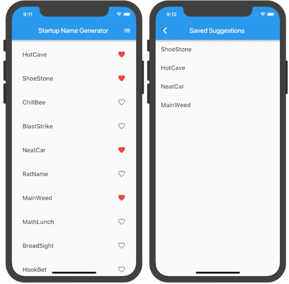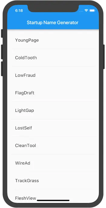 我们将实现一个简单的移动应用 , 它会生成创业公司的名称 . 用户可以选择和反选名称 , 保存最好的那些 . 代码一次生成 10 个名称 . 当用户滑动时 , 新一批的名称就会生成 . 用户可以点击导航栏右上的按钮进入一个只展示喜好的名称的列表新页面.