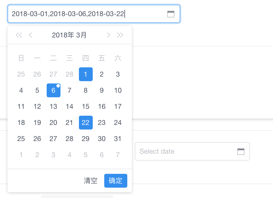 虽然之前版本可以用其它 iView 组件组合出来一个多选的日期,但效果和交互多少会打折扣,该版本只要增加属性 multiple,就可以在一个日期面板上同时选择和呈现多个日期了。如图所示: