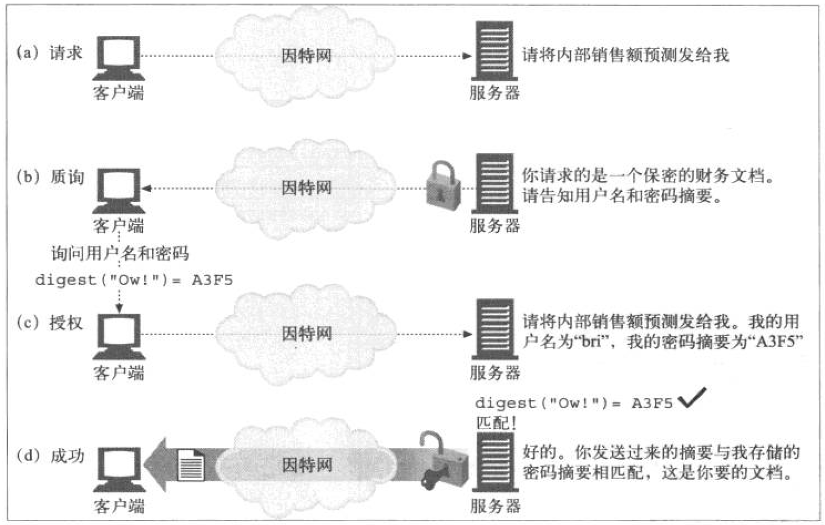 WWW-Authenticate首部发送给客户端(2). - 在(3)中, 客户端选择摘要算法, 通过密码和其他信息计算出摘要. 在(4)中通过
