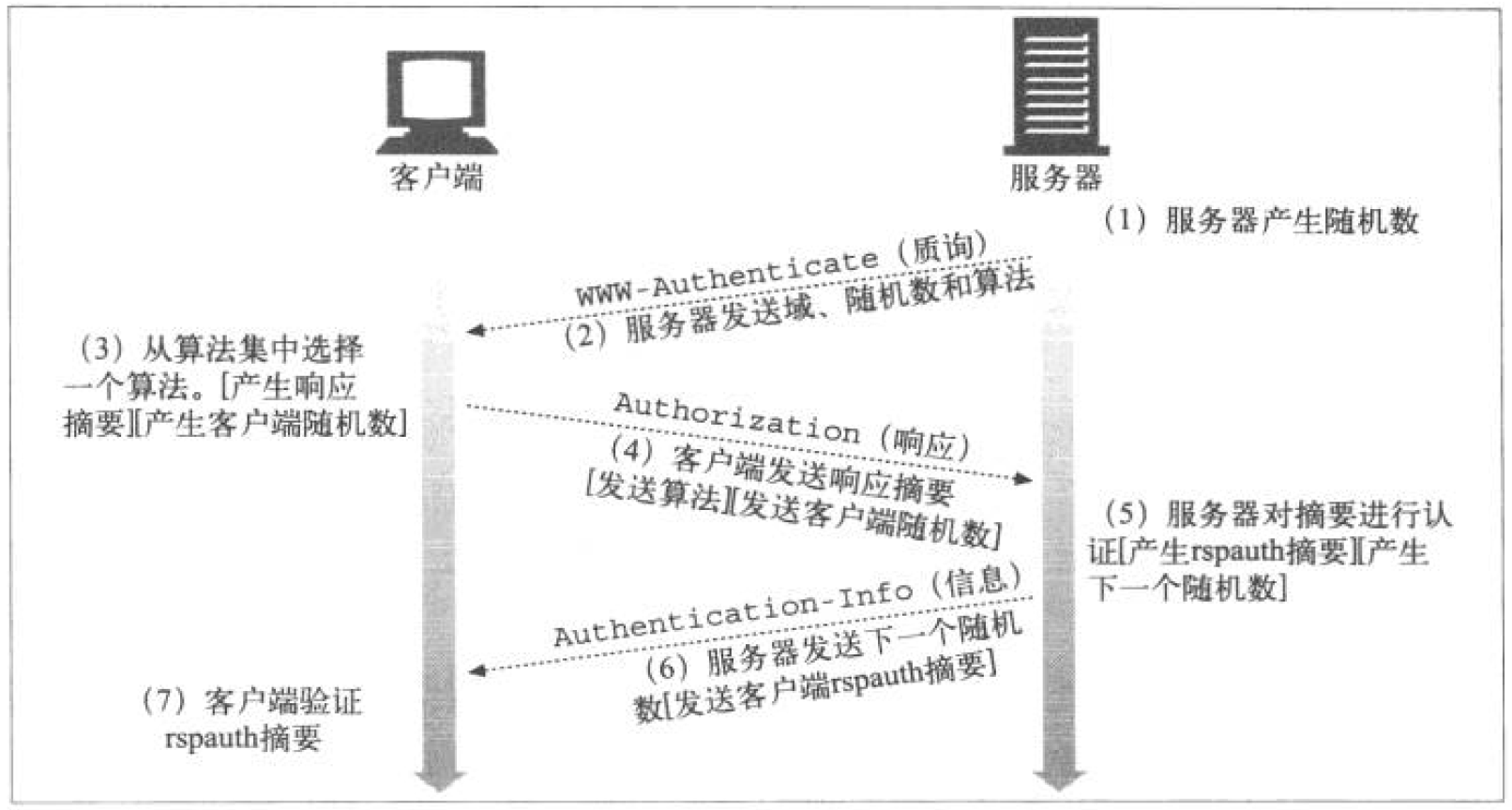 Authorization首部发送给服务器. 若客户端需要服务器进行认证, 可以发送客户端随机数. - (5)中, 服务器接收摘要, 计算自己的摘要, 并验证. 若客户端对服务器进行了摘要认证, 服务器会在(6)中发送计算的摘要, 客户端在接收到数据后就可以进行认证了.