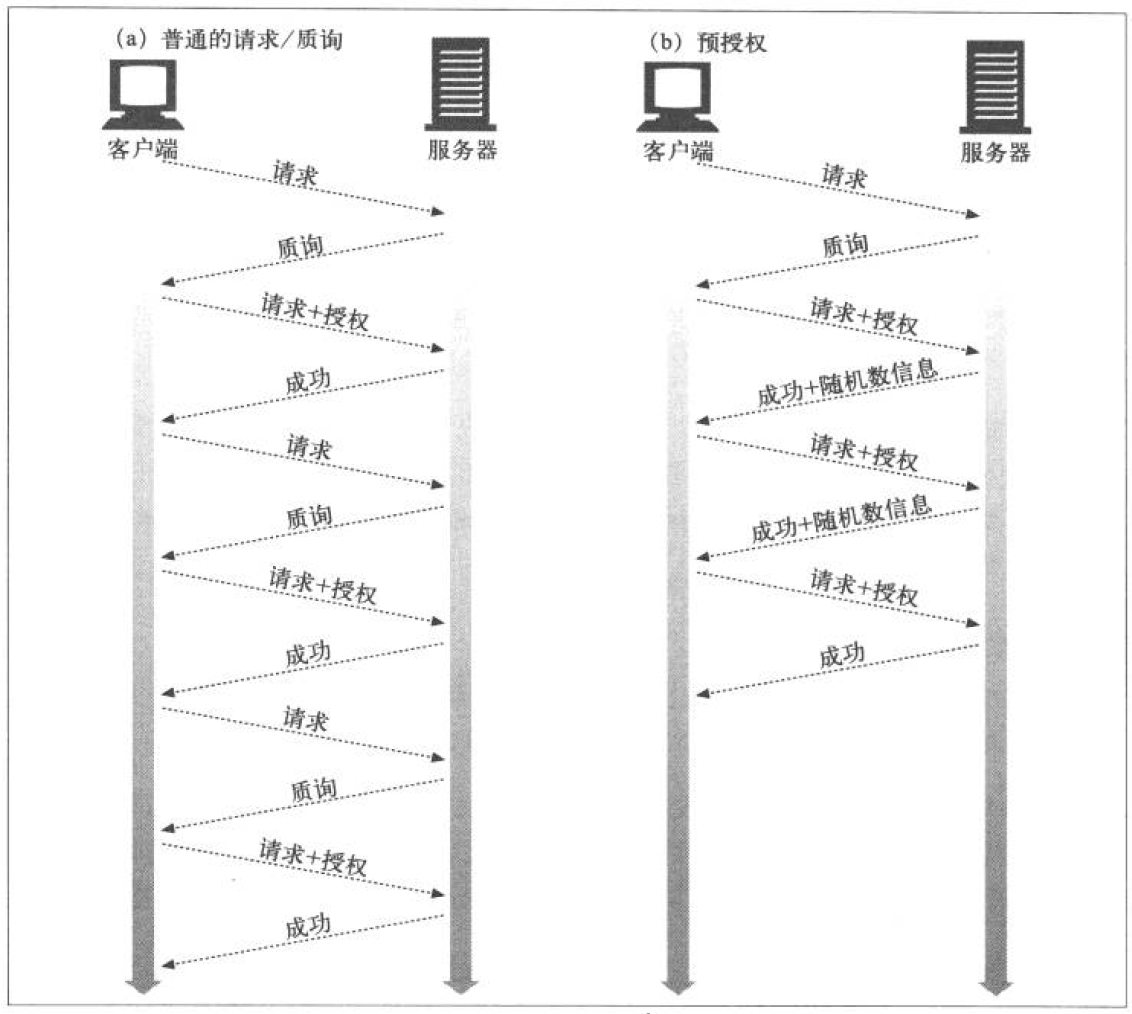 请求质询的过程后, 事先知道认证需要的下一个随机数, 就可以直接发送带有Authorization首部的请求, 这样就可以取消之后的质询环节了(参考上图的b).