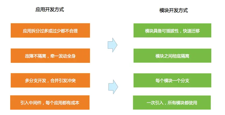 - 模块化开发,模块之间互相隔离,实现故障隔离。