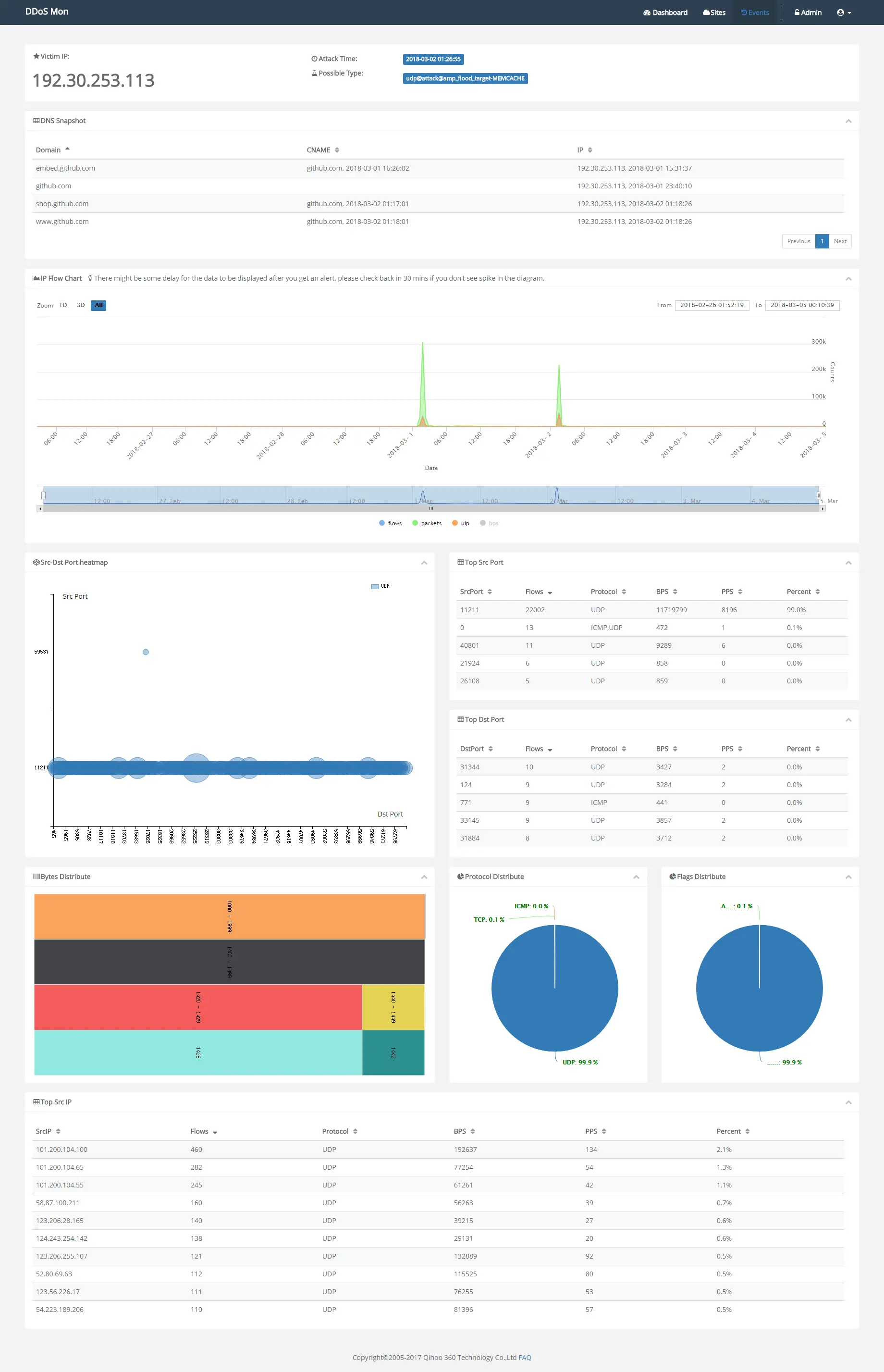 在 DDoSMon 上,我们能看到 www.github.com 这个域名在2018-03-01 和 2018-03-02 遭受了两次攻击,前者就是上文提到的那次攻击: