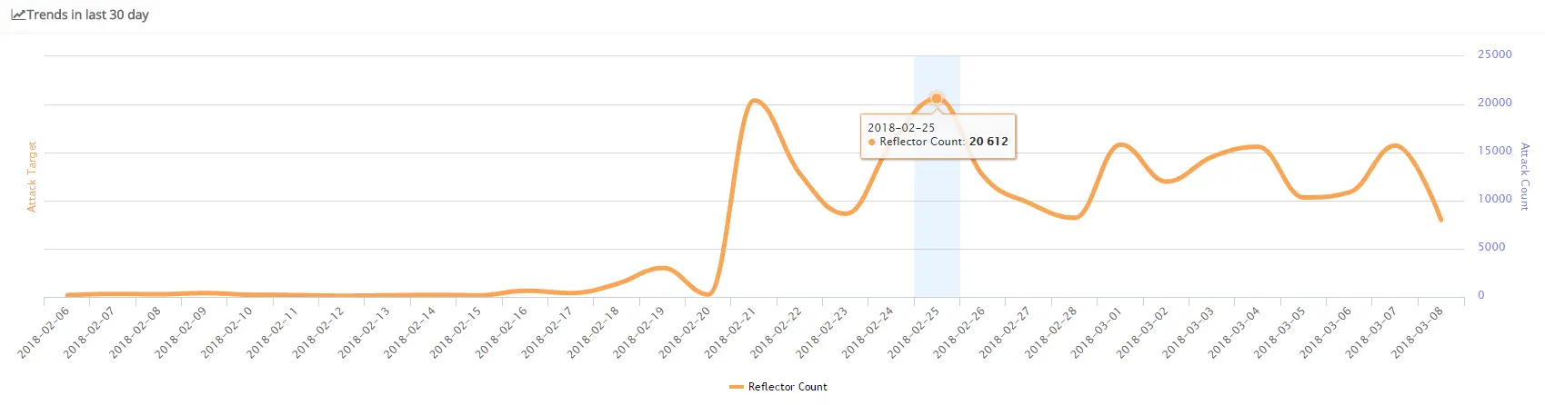 上图是每日活跃(即实际参与了攻击的)的反射点数量。从2018-02-24 快速增长以后,每日活跃的反射点数量一直稳定。