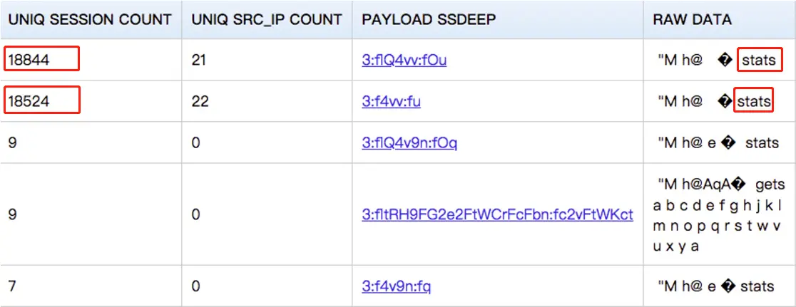 如下表所示,99% 的攻击指令都是基于 memcache stats 指令。