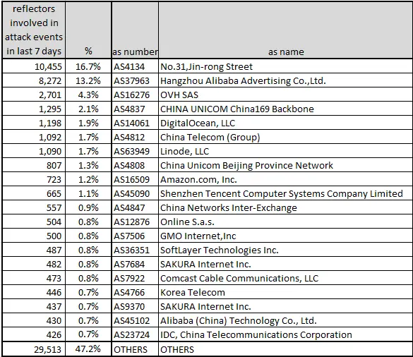 通过对所有反射点的分析,我们发现共有 62k 个反射点已经参与真实攻击事件。其中前20 的ASN 列表如下: