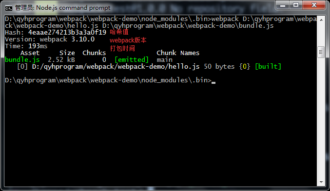 使用webpack打包hello.js文件,同样,不是全局安装webpack的小伙伴们这时得注意路径问题了。