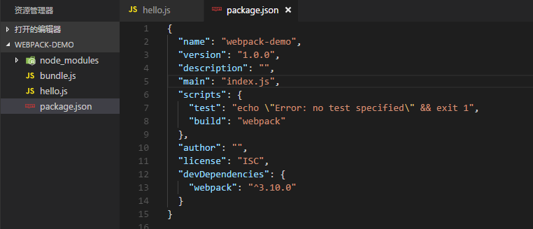 修改package.json文件,在scripts属性中新增执行webpack打包的脚本,比如build,执行npm run build hello.js bundle.js,发现打包成功。