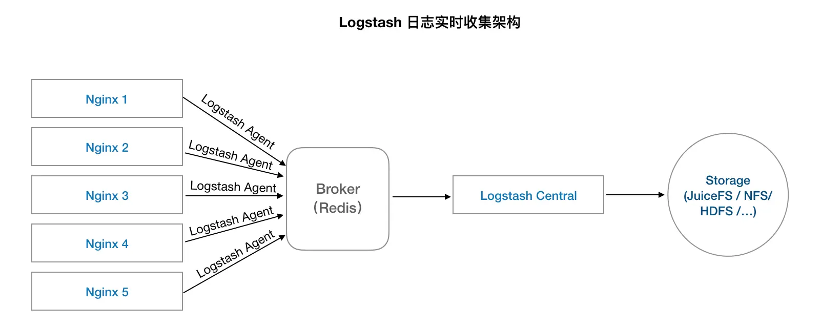 - 在每台机器上部署一个 Logstash Agent(Flume 等其他工具同理);