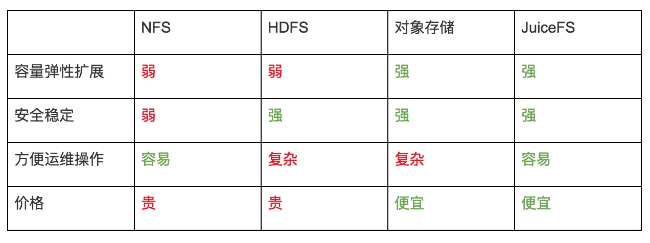在日志的存储上需要里,容量扩展性强,稳定安全,方便运维操作,价格便宜,最好按使用量付费是重点,对于存储性能的要求会低一些。目前常用的有 NFS、HDFS、对象存储等,把这些存储与 JuiceFS 做个比较: