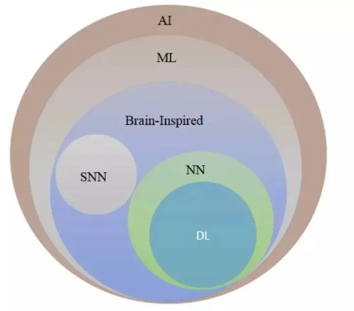图 1:人工智能谱系:AI、机器学习、神经网络、深度学习和脉冲神经网络(SNN)