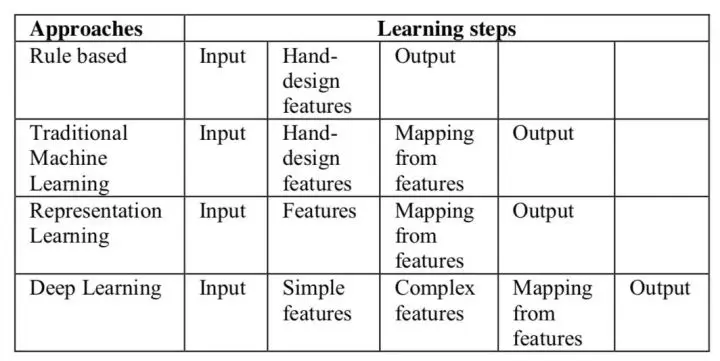 另一方面,在深度学习中,这些特征会被自动学习并在多个层上分层表示。这是深度学习超越传统机器学习方法的原因。上表展示了不同特征学习方法与不同学习步骤之间的关系。